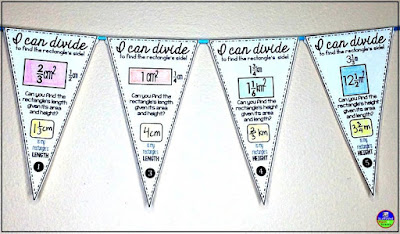 In Algebra 2, most of our students remembered the phrase “keep, change, flip” for dividing fractions. Showing it through pictures is a little tougher! This pennant gives a rectangle’s fractional area and side, then asks students to find the rectangle’s other side.